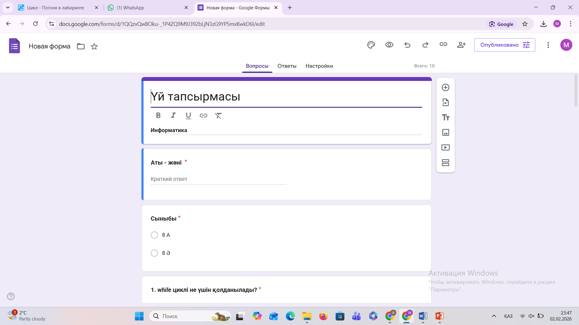 Дескриптор: Тапсырма 1 1 Тапсырма 2 3 Тапсырма 3 4 Қорытынды балл 10 |