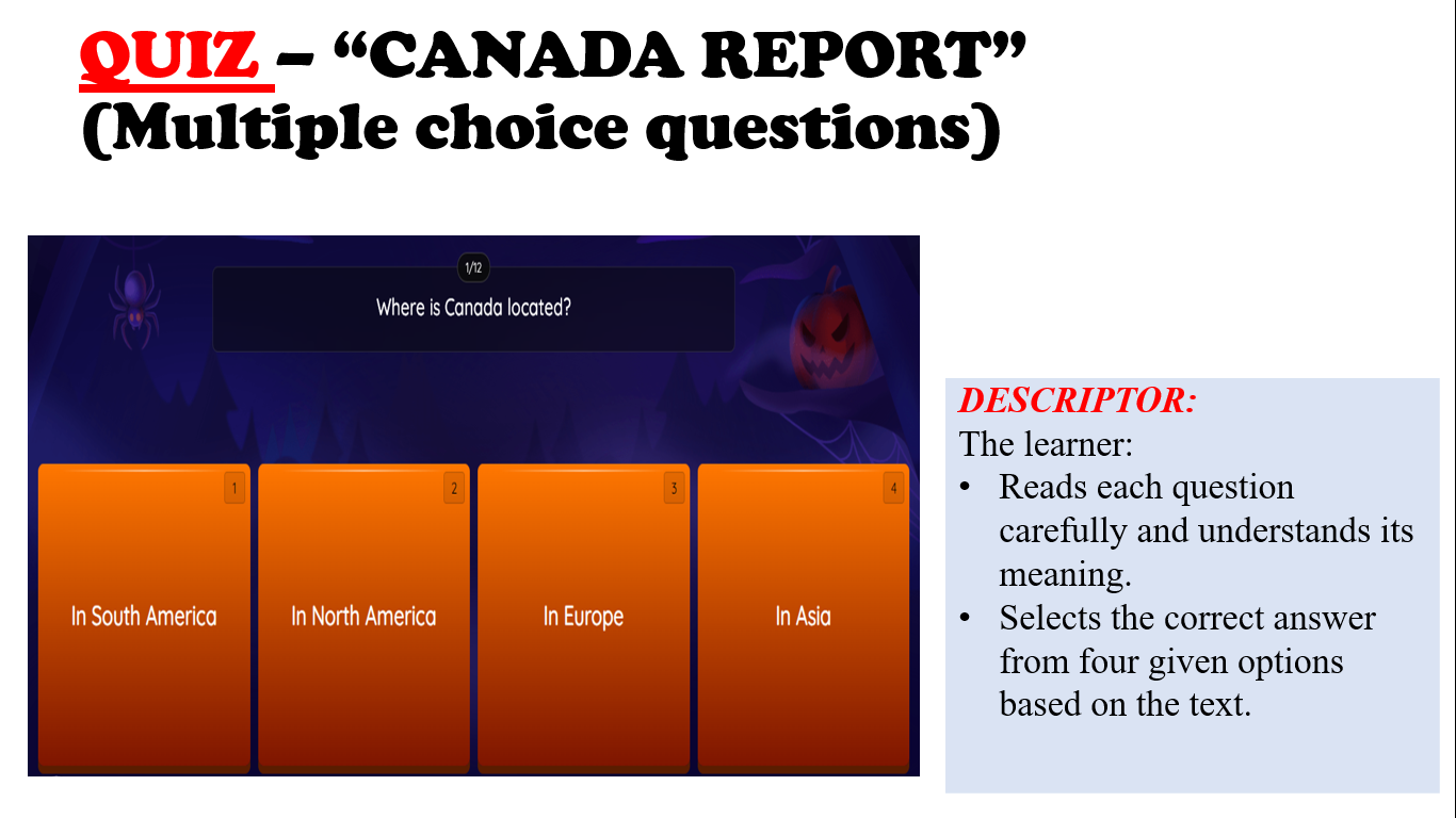 1. Canada is a small country in South America. — False 2. Canada is located in North America. — True 3. The United States is to the north of Canada. — False 4. The Atlantic Ocean is to the east of Canada. — True 5. The Pacific Ocean is to the west of Canada. — True 6. The capital city of Canada is Toronto. — False 7. The capital of Canada is Ottawa. — True 8. The currency of Canada is the Canadian dollar. — True 9. The official languages of Canada are English and French. — True 10. Most Canadians speak French. — False 11. French is the main language in the Quebec area. — True 12. Students in Canada study only English in schools. — False 13. People in Canada also study Spanish, German, and Mandarin. — True 14. The population of Canada is about 34 million. — True 15. Many people in Canada come from Europe, Asia, Africa, and South America. — True Descriptor: The learner: - Reads each statement carefully. - Decides whether each statement is true or false based on the text. - Compares and discusses answers with classmates. QUIZ – “CANADA REPORT” (Multiple choice questions) To check students’ comprehension of the text “Canada Report” and their ability to identify key information and details accurately.