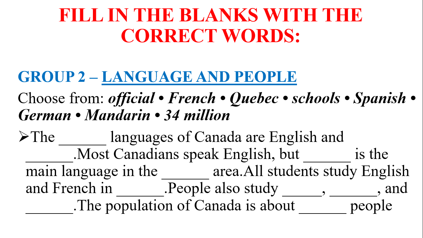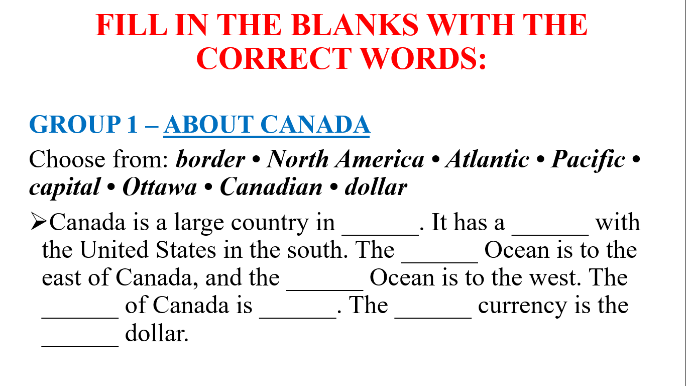 ANSWERS: 1 – Group 1. North America 2. border 3. Atlantic 4. Pacific 5. capital 6. Ottawa 7. Canadian 8. dollar 2 – Group 1. official 2. French 3. French 4. Quebec 5. schools 6. Spanish 7. German 8. 34 million Descriptor: