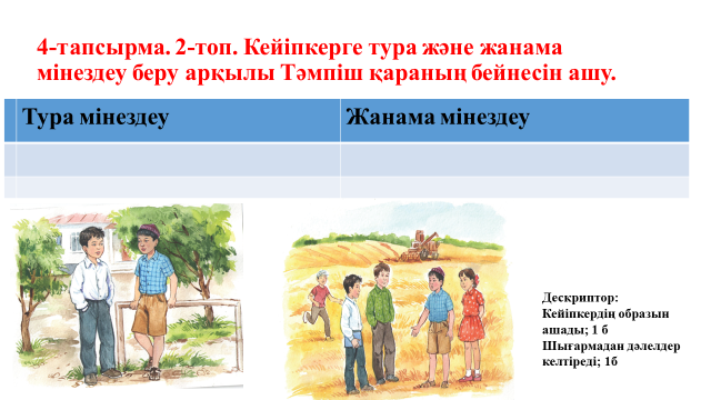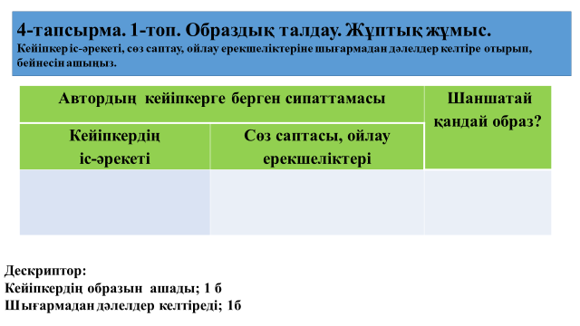 Дескриптор: Кейіпкердің образын ашады; 1 б Шығармадан дәлелдер келтіреді; 1б Дескриптор: Кейіпкердің образын ашады; 1 б Шығармадан дәлелдер келтіреді; 1б |