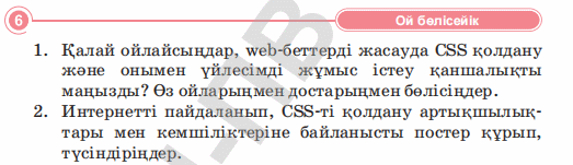 Дескриптор: Web-беттерді жасауда CSS қолдану және онымен үйлесімді жұмыс істеуқаншалықты маңызды екенін айтады Интернетті пайдаланып, CSS –ті қолдану артықшылықтары кемшіліктерініе байланысты постер құрып , түсіндіреді 2 балл Дескриптор: - Кестені дәптерге толтырады 2 балл Дескриптор: -Сандық нөмірленуді әріппен және рим цифрымен нөмірленуге өзгертеді -Әртүрлі маркерді пайдаланып, маркерлеу тізімін өзгертеді 2 б Дескриптор: Сұраққа жауап бер Дескриптор: Жаңа тақырып бойынша сұрақтарға жауап береді 2 балл |