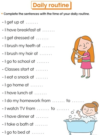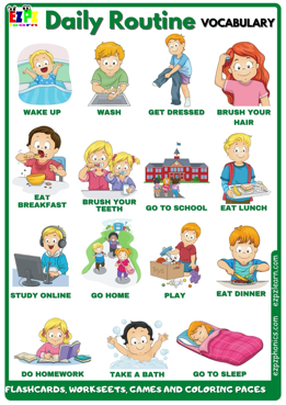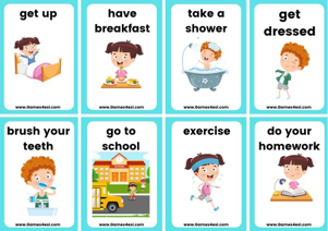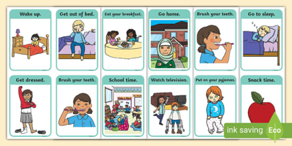 “Wake up” Prepare the Cards: Each card should have a daily routine activity written on it. For example: “Wake up,” “Brush teeth,” “Have breakfast,” “Go to school,” “Do homework,” and so on.You should a describe the action. Through this task, you can open the topic |