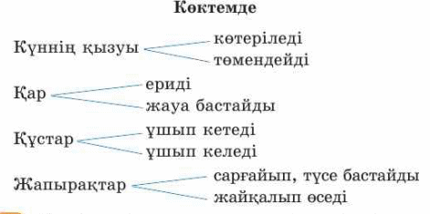 «Leаrning up» платформасы арқылы «Түсіп қалған сөзді тап» ойыны https://learningapps.org/watch?v=p3bwui6tv24 Бір топ торғай ұшып келіп, ағаштың басына қонды. Бұтақ басына бір торғайдан қонып еді,бір торғайға бұтақ жетпей қалды. Сонан соң бір бұтаққа екі торғайдан қонып еді,бір бұтақ артық қалды. Бұтақ нешеу? Торғай нешеу? 31-жаттығу Жазылым дағдысы Жеке жұмыс Тақтамен дәптермен жұмыс Көктемге тән белгілерді көрсет. Сол сөйлемдерді жаз. Күннің қызуы көтеріледі. Қар ериді. Құстар ұшып келеді. Жапырақтар жайқалып өседі.