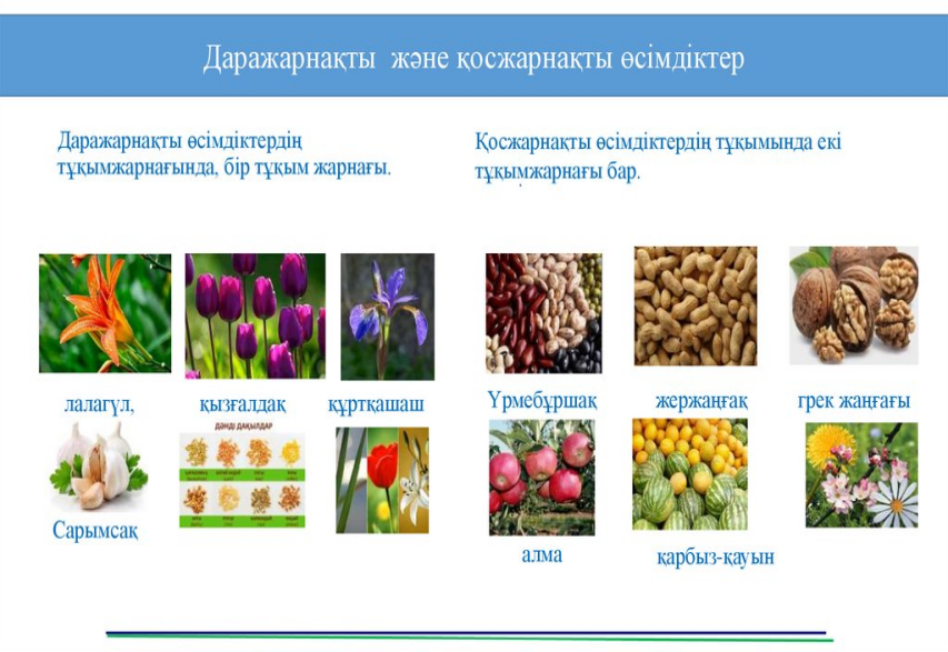 Даражарнақты және қосжарнақты өсімдіктердің құрылысын анықтайды. Даражарнақты және қосжарнақты өсімдіктердің айырмашылығын сипаттайды Даражарнақты және қосжарнақты өсімдіктерге мысал келтіріп, дәлелдейді. |