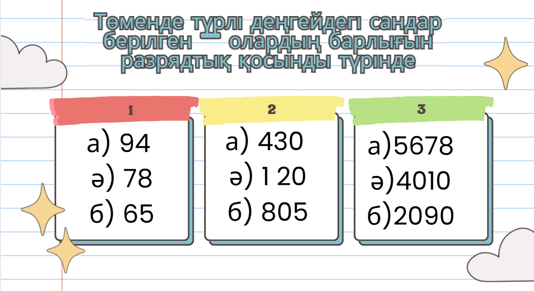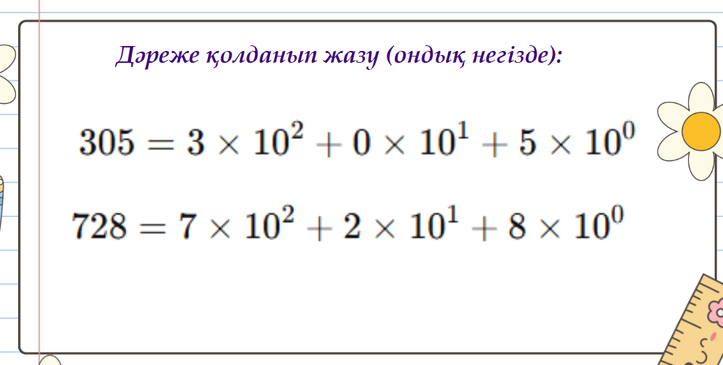 Натурал санның ондық разрядтар бойынша жазылуын түсінеді; Натурал санды разрядтық қосынды түрінде және ондық жазылу түрінде жаза алады. |