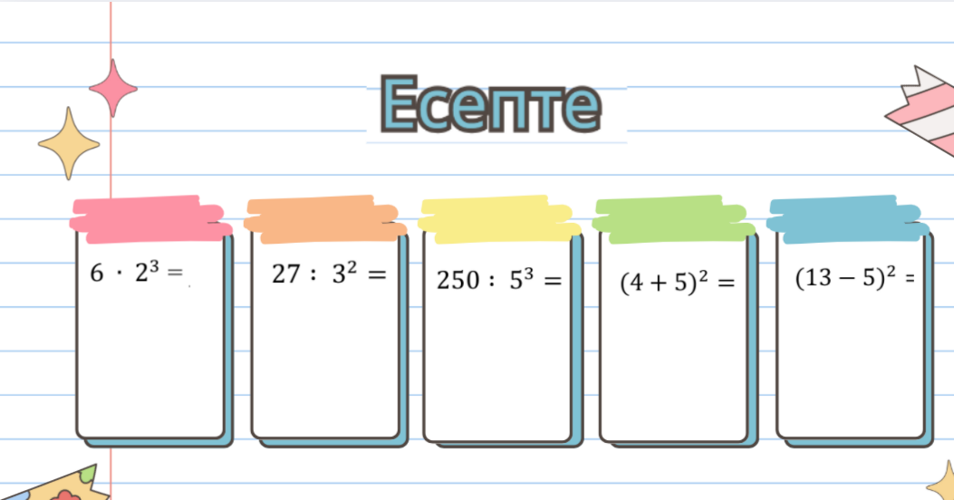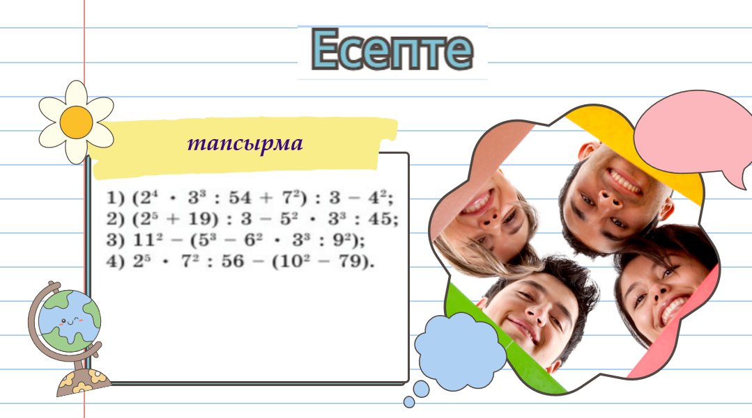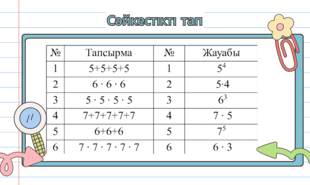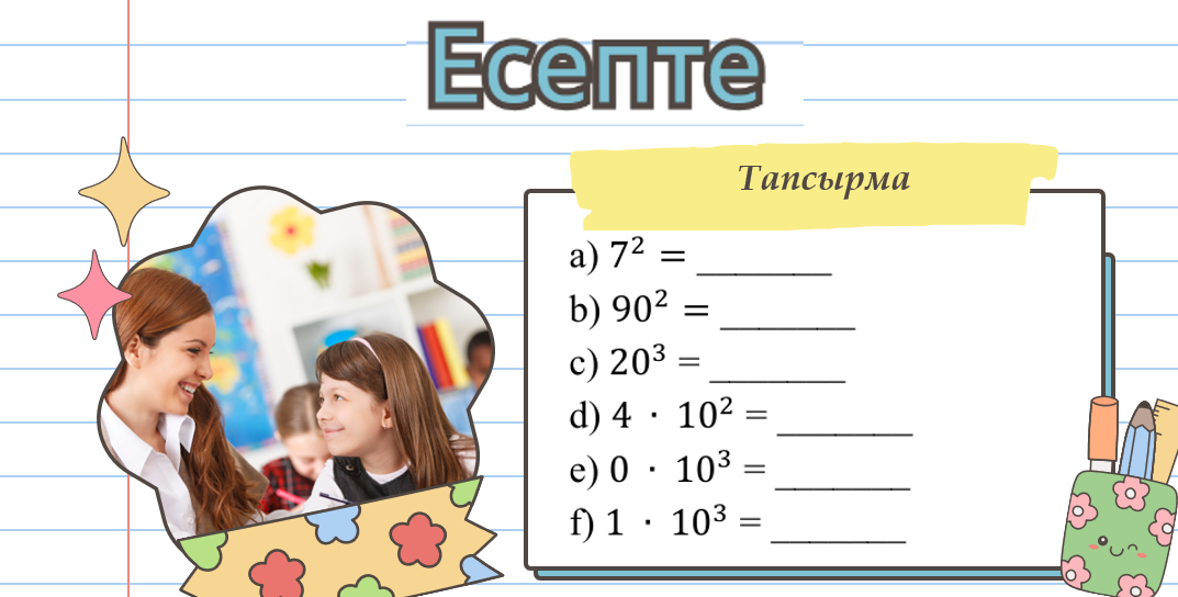 Мұғалім көрсеткен үлгі есептерді дәптеріне жазады Оқушылар тақырыпқа қатысты видеоны көреді және жаңа ұғымдармен (дәреженің анықтамасы, бірдей сандардың көбейтіндісі) танысады. Жұппен/топпен жұмыс жасайды: Қарапайым есептерді бір-бірімен талқылап шығарады Өзара салыстырып, қателерін анықтайды