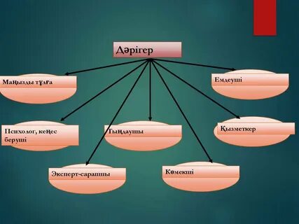 1.Сөздікпен жұмыс. Жаңа сөздермен таныстырады, оқушыларға қайталатады, жаңа тақырыпқа байланысты сөздіктермен жұмыс. Айтылым. тапсырма «Әріптестер» әдісі. - Дәрігер дегеніміз кім? - Дәрігер болу үшін не керек? - Дәрігер не істейді? - Дәрігер қайда жұмыс істейді? Айтылым Жеке жұмыс ЕББҚ:(Зейін тапшылығы және гипербелсенділік синдромы (ЗТГС) (даралап оқыту тәсілі арқылы) Тапсырма орындауда «Аяқталмаған сөйлем» әдісі қолданылады. Жеке қажеттілгі бар оқушы (төмен деңгейлі)«қолдау» әдісі арқылы саралау жүргізіледі. Айтылым 1- тапсырма. Бейнебаян арқылы көтерілген негізгі мәселені түсінеді. Сұрақ қоюда, өз ойларын білдіруде жұрнақ арқылы жасалған туынды сөздерді және күрделі сөздерді ауызша және жазбаша тілдесім барысында қолданады Жазылым Қосымша тапсырма Жеке жұмыс тапсырма Жазылым Айтылым Жеке жұмыс Айтылым 2-тапсырма Жұптық жұмыс