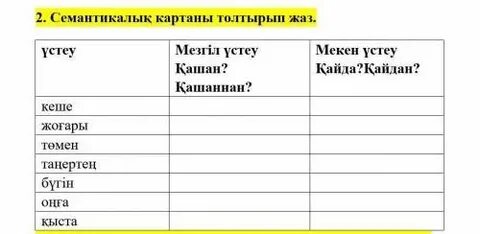Оқылым Мәтінді оқы. «Оқиға картасын» жасау. Әр топқа ватман таратылады. Мәтіндегі іс-әрекетті картаға түсіру, қорғау. Айтылым Көп нүктенің орнына тиісті сөздерді жаз. Мәтіннен үстеулерді тап. Айтылым «Бес саусақ» тәсілі арқылы сабаққа қорытынды жаса. |