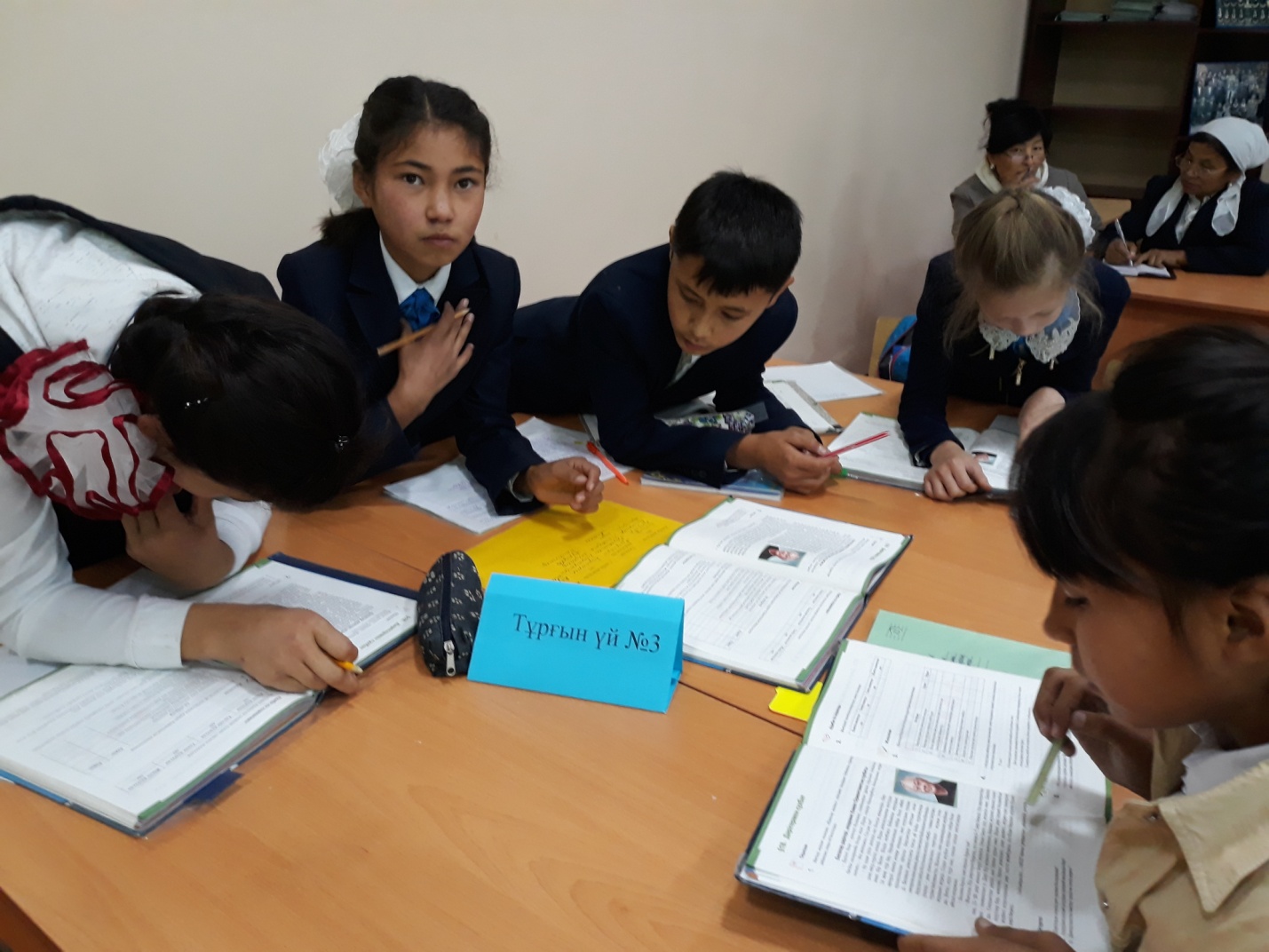 «Тұрғын үй» тренингі жүргізіледі. Тұрғын үйлер: Анарайым – Шерхан, Үміт – Даниял, Данияр – Алина. Қалған оқушылар - тұрғын үйге қоныстанушылар. Оқушылар 3 топқа бірігеді: тұрғын үй №1, тұрғын үй №2, тұрғын үй №3. 2-тапсырма. Мәтіндегі жалғаулы сөздерді тауып, кестеге жазыңдар. (топтық жұмыс) Дескриптор: