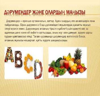 Білімділік: Оқушыларға дәрумендер туралы түсінік беру,олардың адам денсаулығына пайдасын түсіндіру.Дұрыс тамақтанудың маңыздылығын ұғындыру.Тағам құрамындағы дәрумендердің сақталу жолын түсіндіру. Тәрбиелік: Салауатты өмір салтын сақтауға тәрбиелеу.Ас ішу әдебін қалыптастыру. Дамытушылық: Оқушылардың логикалық ойлау,есте сақтау қабілеттерін дамыту.Сөздік қорларын молайту. |