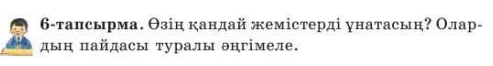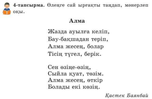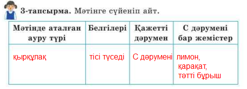 Дескриптор: Жеміс жеудің пайдасын айтады-1балл. Мәтінді дауыстап, мәнерлеп оқиды-1балл. Мәтінге сүйеніп кестені толтырады-4балл. Өлеңге сай ырғақты тауып, мәнерлеп оқиды-2балл.