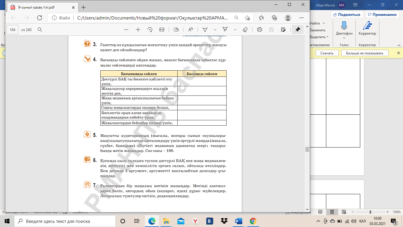 Оқушылармен амандасу, оларды түгендеу, дәптерлеріне бүгінгі күнді жазғызу. Сабақтың тақырыбы мен мақсатын анықтайды. Мәтінді мұқият оқыңыз. Мәтіннен БАҚ туралы оң пікірлерді, содан соң теріс пікірлерді іріктеп оқыңдар. БАҚ туралы теледидар мен газет-журналдарда айтылып жүрген көзқарастарды мысалға келтіріп, авторына сілтеме жасаңдар. Оқушылар грамматикалық тапсырма орындайды. Мақсат бағыныңқы сабақтас құрмалас сөйлем жасалуын біледі; басыңқы сөйлемін ойдан жазып, мақсат бағыныңқы сөйлем құрады. Бүгінгі тақырып бойынша пікірталастырады, өорытынды шығарады. |