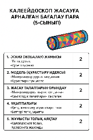 Калейдоскоп жасау Материалдар: ішкі диаметрі 20-50 мм картон түтік (асүй майлықтары немесе үлдірлерінің орамынан), беті жылтыр картон немесе картон және жұқа қаңылтыр, ұсақ мөлдір моншақтар, түсті және түрлі пішінді шыны (пластик) түтік қиындылары, мөлдір пластик дайындамалар. қайшы, қағаз желімі, скотч, пергамент. 6. Бұйымды жасау.Сәндік бұйым Беті жылтыр картоннан үш жолақ қиып алыңдар. Ені картон түтіктің диаметрінен 1.2 есе кіші, ұзындығы түтіктен 1-1,5 см кіші болсын. Олардың шағылысатын (айна) бетін ішке қаратып, үшбұрыш призма құратындай етіп желімдендер. Бір бүйір беттері бір жазық-тықта жататындай етіп, картон түтіктің ішіне орналастырып желімдендер. Сонда түтіктің екінші ұшында бос орын қалады. Мөлдір плас-тиктен диаметрі картон түтіктің ішкі диаметріне тең диск қиып алыңдар. Екінші мөлдір дискті призмаға (бос орынның табаны ретінде) желім-деңдер. Картон түтікке толық жанассын. Оның үстіне (бос орынға) ұсақ моншақтарды салың-дар. Түтікті айналдырғанда моншақтар еркін қозғалатын болсын. Мөлдір пластиктен диа-метрі картон түтіктің сыртқы диаметріне тең жаңа диск қиып алыңдар. Оның бір бетіне пер-гамент жағыңдар. Осы дискті түтікке желімдеу арқылы моншақтар салынған қуысты дұрыстап жабыңдар. Калейдоскопты аударыңдар. Картоннан диаметрі калейдоскоптың сыртқы диаметріне тең диск қиып алыңдар. Оның ор-тасынан диаметрі 8-10 мм тесік жасаңдар. Бұл дискті калейдоскоптың екінші ұшына желім-дендер. Калейдоскоптың сыртын қызықты әрі әдемі етіп безендіріңдер. Ойын : «Еңбек құралдарының жұбын тап» |