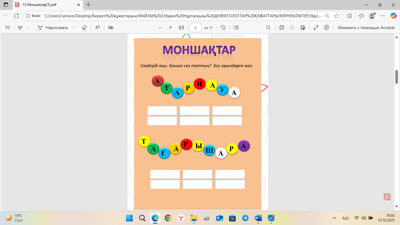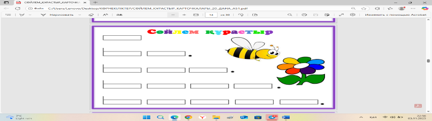 1-тапсырма. Төменде берілген сөздерді буынға бөліңдер. Дыбыстық талдау жасаңдар. Аққулар, қанат, суық, қыс. 2-тапсырма. Балалар, төменде берілген моншақтар қатарындағы әріптерден сөз құраңдар.