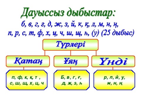 Оқушылар мұғаліммен амандасады. Оқушылар жылы тілектерін айтады. Дауыссыз дыбыстардың түрлерін біледі. Дауысты және дауыссыз дыбыстарды ажыратып жазады. |