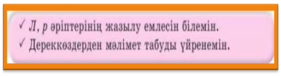2.2.1.1 мәтін түрлерін және құрылымдық бөліктерін (басы, негізгі бөлім, соңы) анықтау; 2.2.5.1 дереккөздерден (сөздік, анықтамалық) мәліметті табу жолын үйренеді 2.4.1.4 дауыссыз л, р дыбыстарының емлесін сақтап жазу |