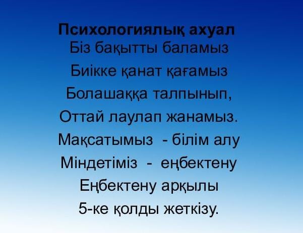 Психологиялық жағымды ахуал орнату. (Ұ) Ұйымдастыру кезеңі