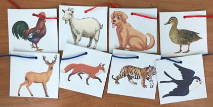 Оқушылар сергіту сәтін орындайды. Оқушылар жануарлар мен құстарды атап, дауысты дыбыстан басталатын сөздерді қызыл түсті бауға, дауыссыз дыбыстан басталатын сөздерді көк түсті бауға тізіп жинайды. - Үй және жабайы жануарлар. |