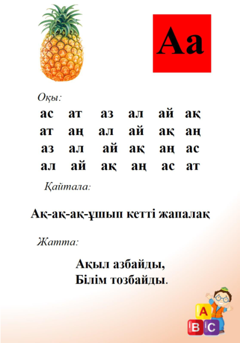 1.2.1.2 оқу түрлерін (буындап оқу, тұтас оқу, мәнерлеп оқу, түсініп оқу) қолдану 1.4.1.1.айтылуы мен жазылуы бірдей сөздерді көшіріп жазу және сету, есте сақтау арқылы жазу; 1.2.8.2.дауысты және дауыссыз дыбыстарды ажырату; дауысты дыбыстардыі жуан, жіңішке болып бөлінетінін түсіну:; |