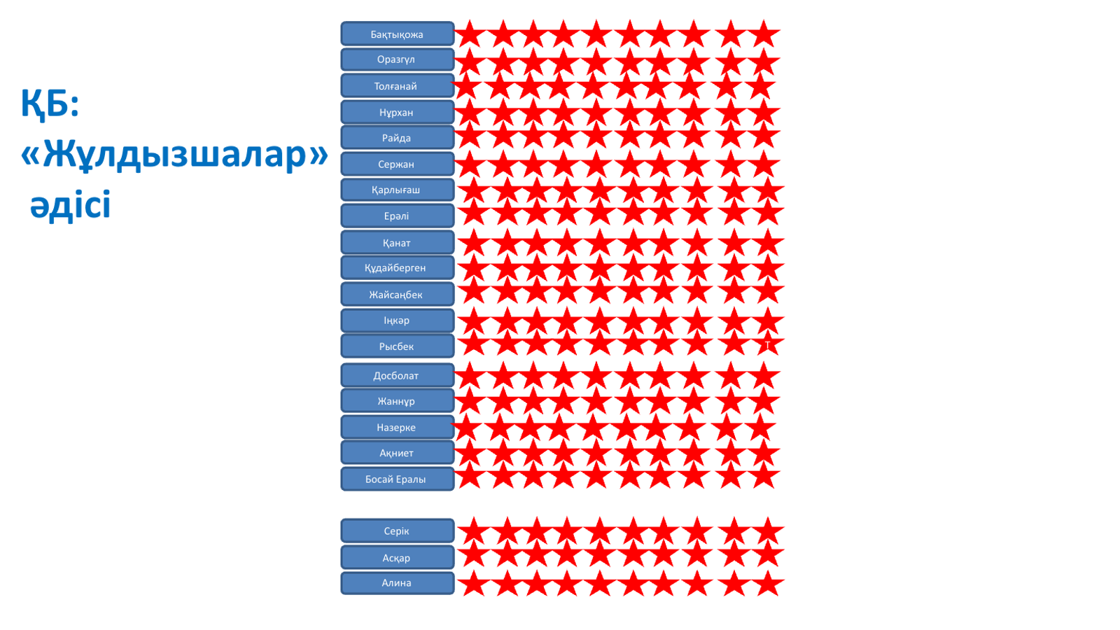 Амандасып алады Мұғалімнің бағыт беруімен оқушылар өлеңді тізбектей, мәнерлеп оқиды. Видеороликті көреді. Әліппе кезеңін пысықтайды Әр топ өз атауына байланысты тапсырманы орындайды Ойын ойнай отырып, дыбыстарды еске түсіреді Жаттығу жасайды Дәптермен және тақтамен жұмыс жасайды Көршісімен жұптаса отырып сөздерге дыбыстық талдау жасайды Өз ойын айтады Берілген сұрақтарға дұрыс жауап береді Кері байланыс жасайды |