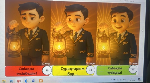 Психологиялық ахуал қалыптастыру Өткенді пысықтау: ЖИ: «Wordwall» ойыны Жаңа тақырып Оқылым «Стоп» әдісі 1-жаттығу. ФС тапсырмасы «Қыста» өлеңін мәнерлеп оқу. «Қыста» Жи арқылы жасалған видеороликті көрсету. Сөздік жұмыс Үсітті- суықтан қатты тоңып домбығу Топтық жұмыс 1-топ: «Дыбыстар» «Дыбыстарды ажырат» ойыны Сурет түрлеріне қарап әріптерді үйшіктерге орналастыру 2-топ: «Әріптер» «Дыбыстарды ажырат» ойыны Сурет түрлеріне қарап әріптерді үйшіктерге орналастыру 3-топ: « Сөздер» «Адасқан сөздер» ойыны Араласып жатқан әріптерден сөздер құрайды 4-топ : «Буын» «Адасқан сөздер» ойыны Араласып жатқан әріптерден сөздер құрайды Сергіту сәті Әуенмен бірге жаттығуларын жасайды Дәптермен жұмыс Жазылым. 3-жаттығу Оқулықтағы сурет бойынша берілген сөздерді қолдана отырып тақтаға сөйлем құрап жаз «Киіз үй» әдісі Жұптық жұмыс Сөздерге дыбыстық талдау жаса ЕБҚ Мақсаты: сөйлеу мәнерін жаттықтыру Қыс туралы сурет сал. Қыс туралы білетініңді айт Қорытынды тапсырма ЖИ: «Wordwall» ойыны