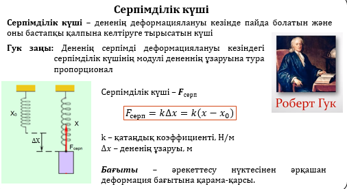 7.2.2.3 – пластикалық және серпімді деформацияларды ажырату, мысалдар келтіру. 7.2.2.5 – Гук заңының формуласы бойынша серпімділік күшін есептеу |