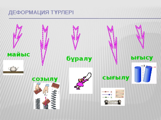 Ойша эксперимент: Жұқа тақтай екі блоктың үстіне қойылды. Егер осы конструкцияның үстіне ауыр денені қойсақ не байқалады? Тақтай дененің ауырлық күші әрекетінен майысады, яғни деформацияланады Оқушыларға деформация ұғымын түсіндіріп, оның түрлері туралы айту. Талқылау: суретте берілген мысалдарда қандай деформация көрсетілген?