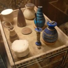 Румяна и губную помаду в то время изготавливали из красной глины. Тени – из толченого малахита, порошка ляпис-глазури или смеси сурьмы со свинцовой рудой. Краски для глаз не только помогали сделать взгляд более выразительным, но и отпугивали насекомых.