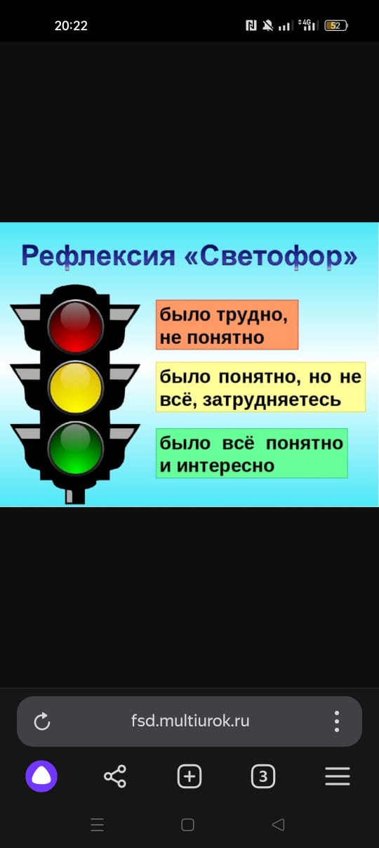 Участвуют в рефлексии, выражают свое настроение с помощью светофора и устно оценивают содержание урока. |