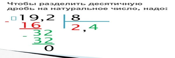 Выполняют задания тренирующие отдельные способности к учебной деятельности, мыслительные операции и учебные навыки. Чтобы разделить десятичную дробь на натуральное число, надо разделить целую часть на это число. Когда закончится деление целой части, поставить в частном запятую. Продолжить деление дробной части. |