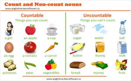 • Pupils collect the pop corns into two box ANSWERS Countable nouns: Potato, apple, orange, egg, cake, sausage, tomato, carrot, banana Uncountable nouns: meat, butter, water, rice, bread, cheese, sugar, biscuit, milk, ice ANSWERS