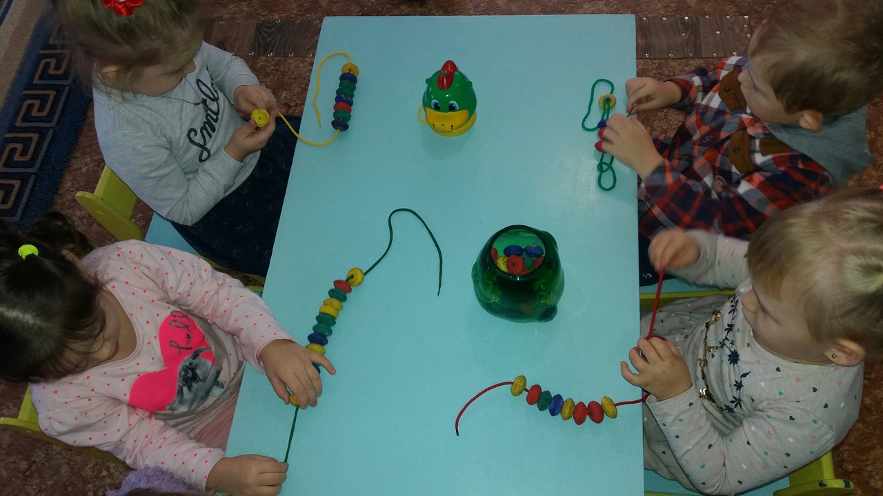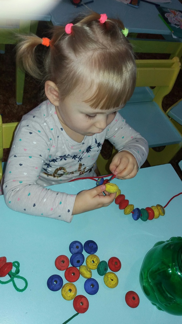 (Детям предлогаются разноцветные бусы в коробках и ленты, дети нанизывают бусы самостоятельно . если возникают трудности воспитатель помогает. Нанизывая бусы воспитатель спрашивает у детей цвет бусенки.)