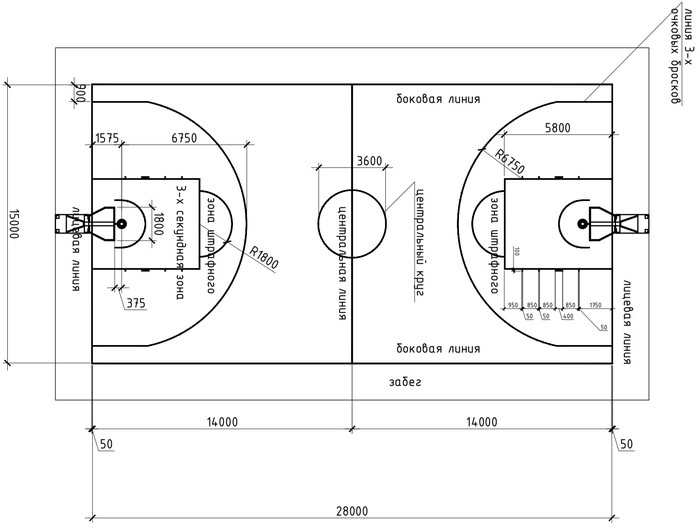 Баскетбол алаңының стандартты өлшемдері: ұзындығы 28 м, ені 15 м. Ойыншылар допты лақтыруға, пас жасауға, домалатуға немесе дриблинг арқылы жылжытуға құқылы. Допқа қол тигізгеннен кейін ойыншы тек екі қадам жасауға рұқсат алады. Әдетте ойын 20 минуттық екі таймнан тұрады, таймдардың арасындағы үзіліс 10 минут. Кәсіби жарыстарда ойын төрт ширектен (квартал) тұрады, әрқайсысы 10–12 минут, орталық үзіліс 15 минутқа дейін созылады.