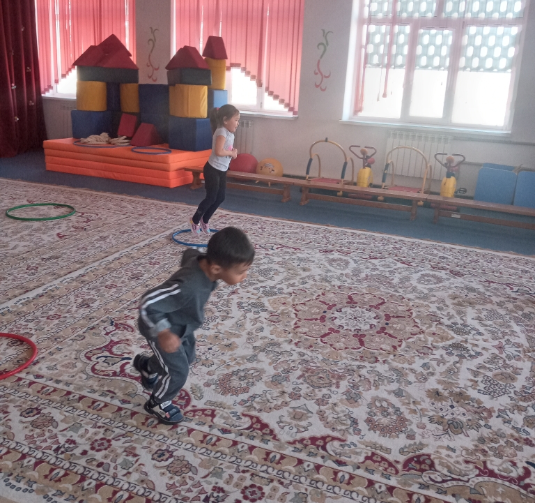 Ойын шарты: Кругтан-кругқа секіріп,алға қарай қоянша секіріп,межеден айналып қайту.