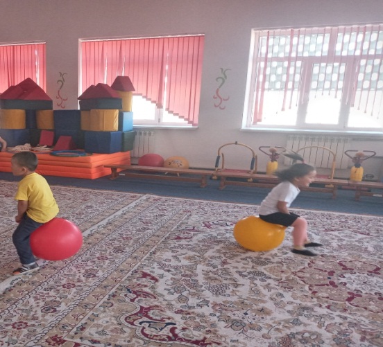 Ойын шарты: Текшелер арасымен кенгуру добымен өтіп,кері секіріп қайту.