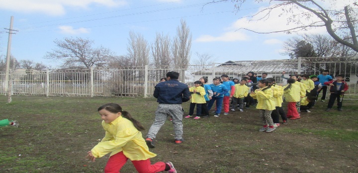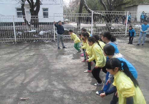 Топ оқушылары төрешінің белгісі бойынша секіртпемен жүгіреді.