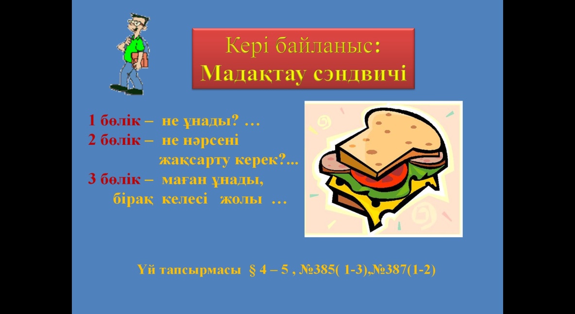 Жүргізілген жұмыс түрлері қаншалықты тиімді: Оқушылардың үй тапсырмасын шығармашылықпен орындағаны,бірін-бірі бағалай алуы тиімді өтті. Оқушылардың белсенділігі: жақсы Кездескен кедергілер мен оны еңсеру жолдары: 3тапсырманың бірін таңдап жазуда бірнеше оқушы үлгере аламай, қосымша сабақта аяқтады.Келесіде ол оқушыларға жеке тапсырма даярлау керек деп жоспарлап отырымын. («С» деңгейлі оқушы)