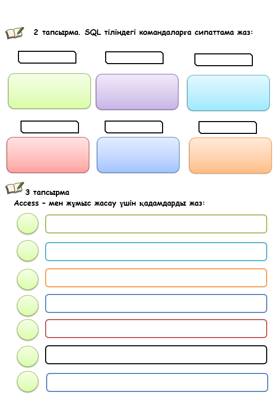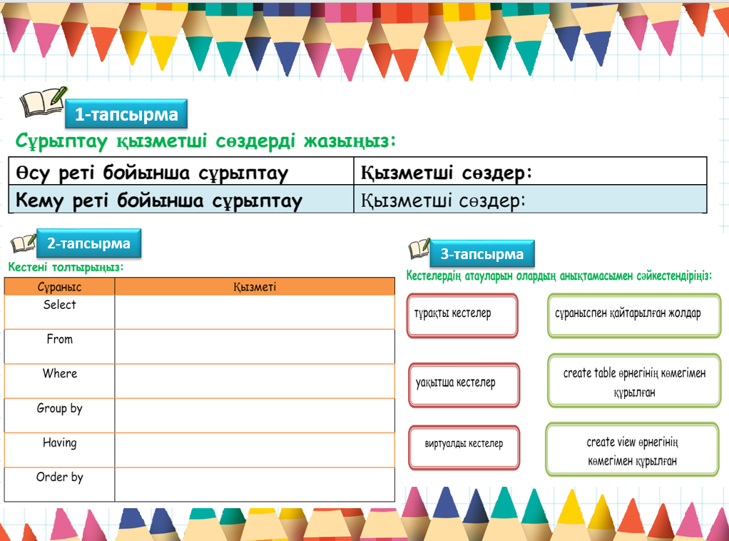 Оқушылар жеке жұмысты компьютерде орындайды. Берілген тапмырмада кестені толтырып сұраныс жасап, SQL тіліне айналдырады. Командаларды жазады. |