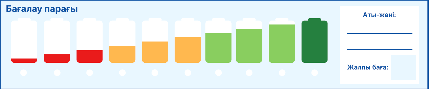 Әр оқушыға бағалау парағын тарату. Нәтижесінде алған баллдарын жинақтап 10 баллдық критериймен бағаланады.