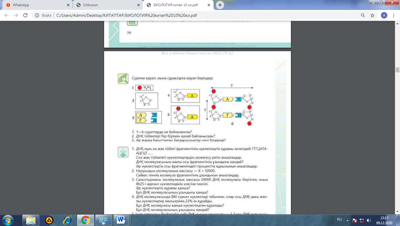 Дескриптор: Жалпы - 4 балл 1.нуклеотид-тің құрамбөлік-терін дұрыс анықтайды 2.сол жақ тізбектегі нуклеотидтерді дұрыс жазады 3.днқ молекуласының ұзындығын есептейді 4.әр нуклеотидтердің проценттік құрылымын табады Жалпы -4 балл |