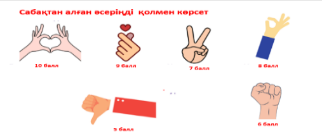 Кері байланыс «СМС» -Бүгінгі сабақта не ұнады? -Сабақтан қандай ой түйдің? -Бүгінгі сабақтан алған білімің үшін өзіңе қандай баға бересің? Рефлексия: «Белгі» әдісі бойынша өтеді. Оқу тапсырмасы:26- тапсырма |