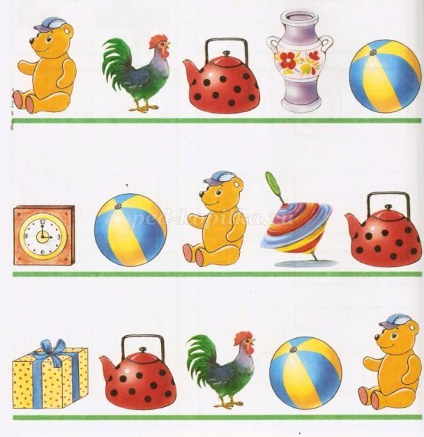 Цель: развивать память, внимание, логику, умение ориентироваться на плоскости, учить вычленять контур предмета, соотносить объемную форму с плоскостной, узнавать предметы в рисунке, знать их названия.