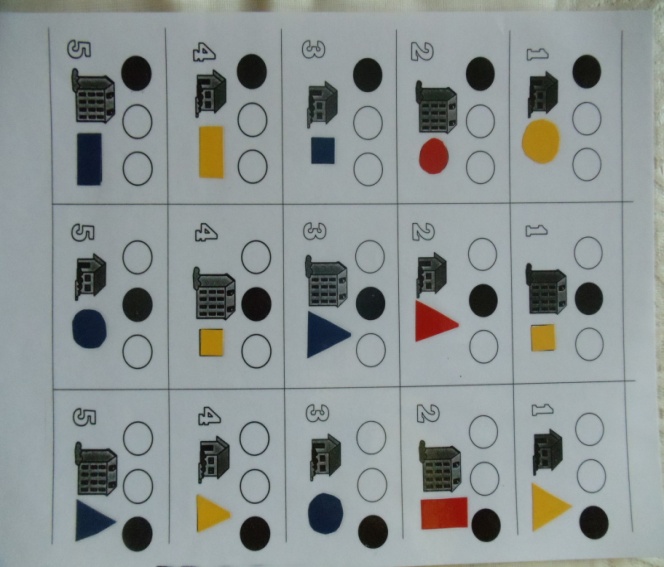 Ход: Каждому из дошкольника педагог предлагает взять большую карточку, а себе оставляет маленькие карточки, предварительно разложив их по формам. Воспитатель поднимает одну карточку, например, круг, и спрашивает: «У кого такая?» (форма не называется). Те, у кого на карточках есть круг поднимают руки и воспитатель раздает им маленькие карточки с кругами, одновременно проверяя правильность выбора: «Хорошо, справились, у меня круг и у вас круг». Дошкольники накладывают маленькие карточки на соответствующее изображение. Затем, педагог переходит к другой форме и поднимает, например, трапецию. Однако, при оценке ответа дошкольников, он не называет эту форму, так как с ее названием детей не знакомит, а просто говорит, что дети сделали правильно.