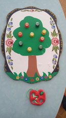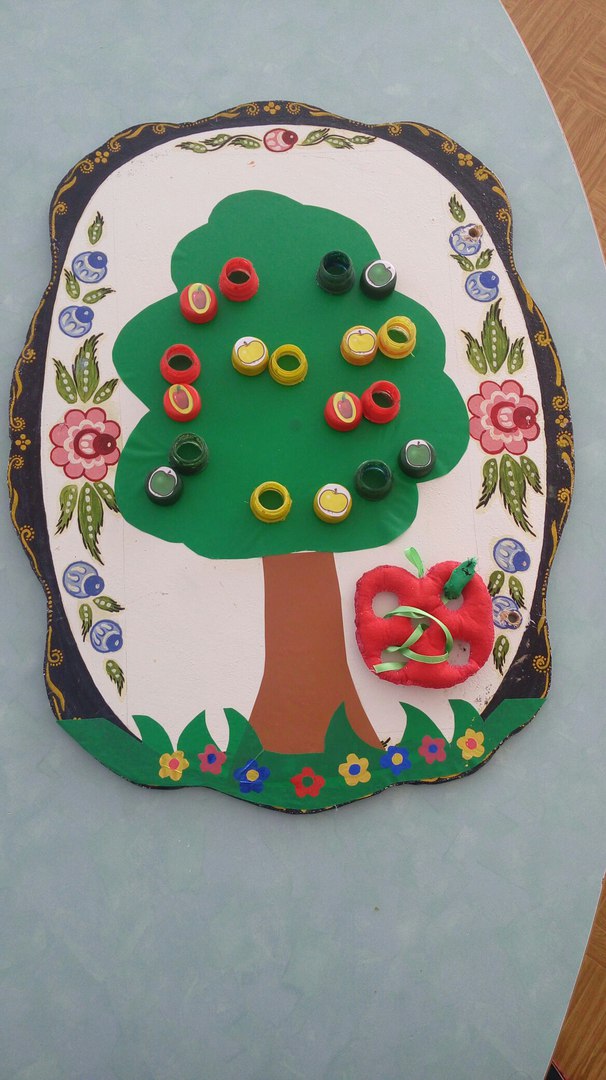 Ойын барысы: Балабақшада сенсорлық тәрбие беру бойынша «Ағаштағы алмалар және құрт» тақырыбы бойынша дидактикалық ойын.Ойын барысында алма ағашына әр-түрлі түстегі алмаларды орындарына қою. Құрт түскен алмаға бауды өткізу.
