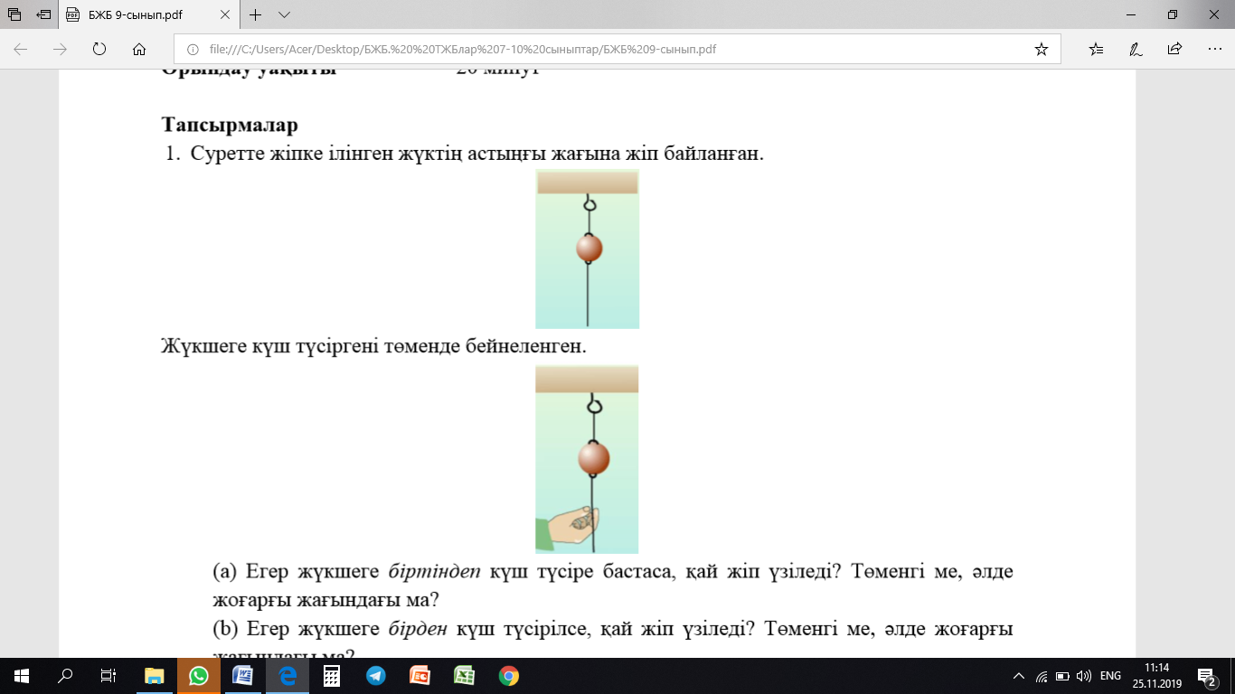 . Суретте жіпке ілінген жүктің астыңғы жағына жіп байланған. Жүкшеге күш түсіргені төменде бейнеленген.