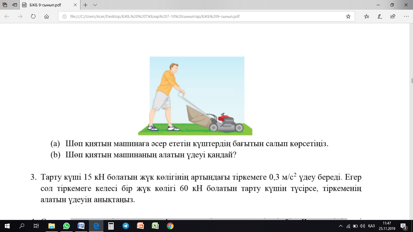 Көгалды қиятын машинаға сырттан әсер ететін күш 51 Н. Ал машинаның массасы 24 кг. Көгал мен машинаның табаны арасындағы үйкеліс күші 10 Н.