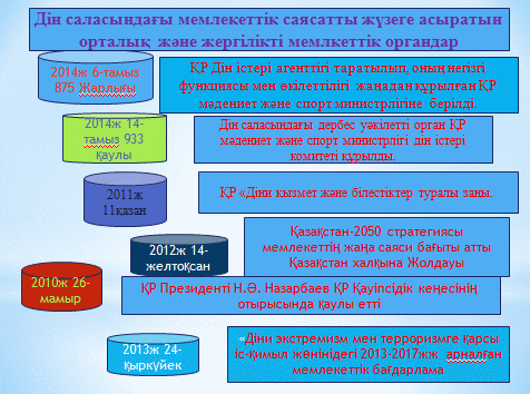 Дін саласындағы мемлекеттік саясатты жүзеге асыратын орталық және жергілікті мемлекеттік органдар. |