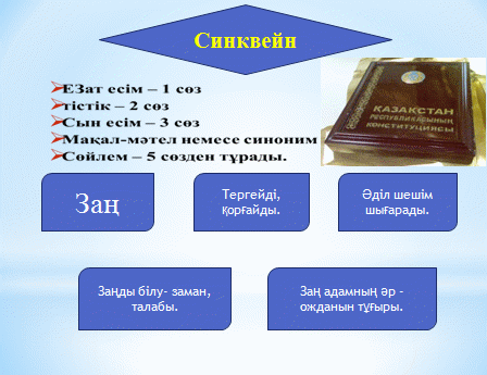 Мұғалім сабақты қорытындылайды. «Синквейн» әдісі бойынша тақырыпты қорытындылаймыз. Әр топқа бір сөз беріледі, оқушылар сол сөзге сипаттама береді. |