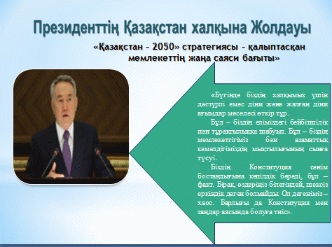 Қоғам өміріндегі өзгерістер, мемлекеттің дін тұрғысындағы саясаты, Елбасы Н.Ә.Назарбаевтың Қазақстан Республикасы және халықаралық қауымдастықта бейбітшілік пен дінаралық келісім орнату саласындағы саясатын, қайраткерлігін бағалай білуге, түсінуге тәрбиелеу, отаншылдық сезімдерін қалыптастыру мақсатында өз баяндаманы жасадым. Діннің адамзат тарихында алатын орны ерекше. Өз тарихында діни санасы болмаған халық жоқ. Адамның пайда болуынан бері өмір сүріп келе жатқан діннің өзіндік мәні зор. Дінге көзқарас әр дәуірде, әр қоғамда әрқилы болып келген. Сондықтан дін дегеніміз не, оның тарихы қандай бүгінгі қоғамда өмір сүріп жатқан әр оқушы үшін мәдени қажеттілік. Дін мен қоғам бір-бірінен ажырамайтын ерекше құбылыстар. Дін –қоғамдық құбылыс,ал қоғам –мемлекеттің негізі. Қазір өркениетті қоғамда өмір сүріп жатырмыз. Өркениетті қоғамның әрбір адамы өз болмысымен, дінімен, елдік санасымен бірге адамзатқа ортақ мәселелер туралы келелі сөздер айта білуі қажет. Осы бағытта Н.Ә.Назарбаев өзінің ерекше қоғам қайраткері екендігін дәлелдеп берді. Олай болса бүгінгі баяндамамда дін, діннің қоғамда алатын орны, діни келісім бірлік пен тұрақтылық кепілі екендігіне көз жеткіземіз, Елбасының осы бағыттағы саясатына баға беруге қадам жасаймыз. Діни келісім – бірлік пен тұрақтылық кепілі. Діни келісім мен конфессиаралық бейбітшілік, бірлік тұрақтылық көпұлттық көптілді және көп конфессиялық Қазақстан үшін күрделі мәселе. Бүгінде Қазақстан әлемге бүкіл әлемдік діни-рухани форумның орталығы есебінде де таныс. Оған әлемдік және дәстүрі діндердің басшылары діни мәселелерді шешу үшін жиналады. Қазір қазақстандағы діни ахуал дүние жүзінде тұрақты болып табылады. Негізгі діндер ислам мен православие арасындағы байырғы және достық қатынастар қалыптасты. Құрбан айт және Рождество ресми түрде демалыс күндері саналады. Біздің ұлт аралық және конфессия аралық келісім үлгісі - Қазақстанның кемсітушілікке қарсы күрес пен өзара түсініктікті және жаһандық қауіпсіздікке қолдау көрсетуге қосқан үлесі болып табылады. Қазақстан бұрыннан келе жатқан әлемдік діндердің қиылысу жолының орталығы болып отыр. Осыған қатысты Елбасымыз Н.Ә.Н. өзінің Жолдауында «Біздің топырағымыз арғылы барлық әлемдік діндер өткен. Осынау рухани дәстүр- Қазақстандағы конфессиялар арасындағы татулықтың аса маңызды тұғырларының бірі. Бұл жетістік арқылы біз күллі әлемге танылмақпыз. Ұлтаралық және дінаралық келісімнің қазақстандық моделін қарастыратын болсақ. Мұнда Қазақстанда ұлтаралық және дінаралық келісімнің тұрақты моделі қалыптасқанмен, ол мемлекет, азаматтық қоғам,оның ішінде діни бірлестіктер тарапынан үздіксіз қолдау көрсетіп отыруды қажет етеді. Осы арада Қазақстанда дінаралық қатынас орнатудың негізгі ұстанымдарын атап өту керек. Елдің Конституциясы мен заңдары ар-ождан бостандығы мен діни сенімді қорғауға кепілдік береді. Конституция діни, этникалық және басқа тұрғыдағы кемістушіліктерге тыйым салады. Қазақстан Республикасы «Діни сенім бостандығы мен діни бірлестіктер туралы «Заңы діни бірлестіктердің еркін іс-әрекет жасауы үшін барлық құқықтық негіз қалады. Ел маңызды халықаралық келісімге және адам құқығына қатысты шарттарға оның ішінде Біріккен Ұлттар Ұйымының негізгі халықаралық келісіміне қосылады. Мемілекет конфессиялардың