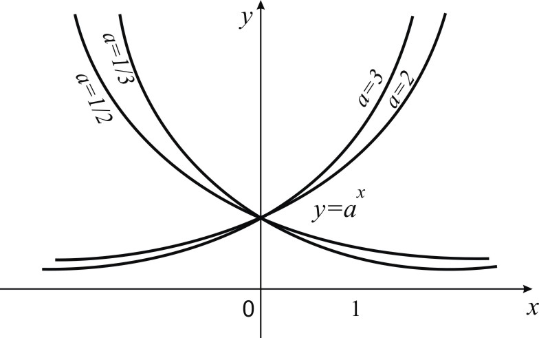 а>1 негізі қаншалықты үлкен болса, у=ах функциясының графигі де оңға қарай соншалықты жоғары көтеріліп, және нүкте солға қарай жылжығанда асимптотаға тезірек жақындайды. 2 - суретте у=ах көрсеткіштік функциясының негізі а=2,3, 1/2, 1/3 мәндерін қабылдағандағы графиктері көрсетілген. Бұл графиктердің у=2х және у=(1/2)х (немесе у=3х және у=(1/3)х) сәйкесінше, Оу өсіне қарағанда симметриялы екенін байқаймыз. Шынында да, у=(1/2)х функциясының у=2х түрінде де жазуға болады; егер (х,у) нүктесі у=2х функция графигіне тиісті болса, онда - Оу өсіне қарағанда оған симметриялы болатын (-х,у) нтктесі де у=2х графигіне тиісті болады.